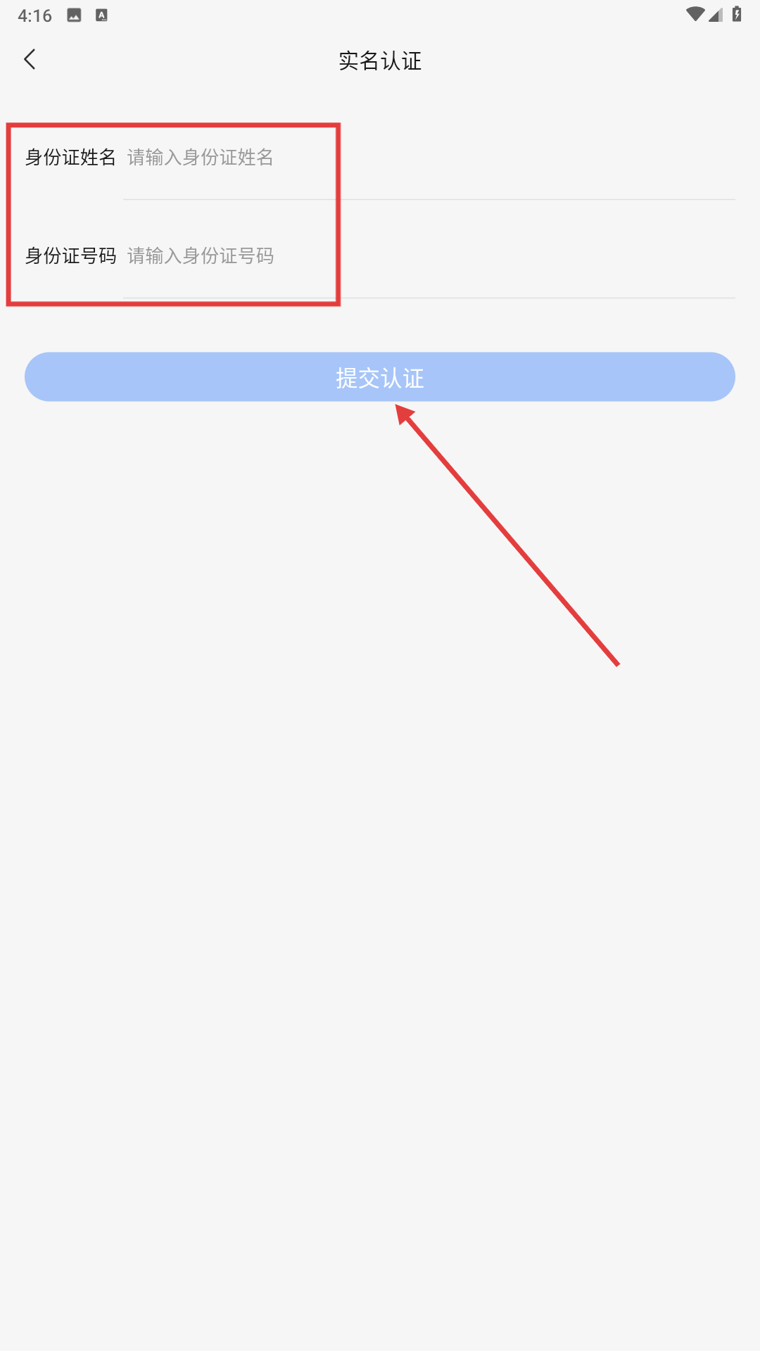 2、进入实名认证页面后,在【身份证姓名输入框】和【身份证号码输入框】中分别填写对应信息,随后点击提交认证按钮。