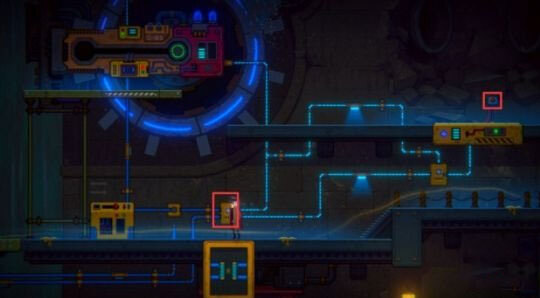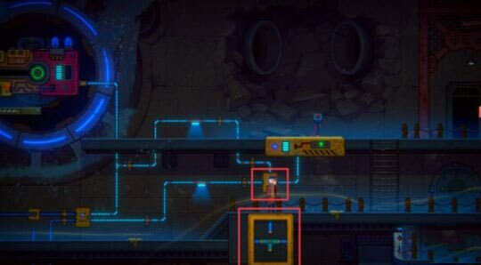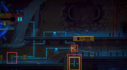 继续往下走,按照图示调整水车下方的电分流器,确保电路布局和图中所示完全相同。之后前往右侧区域,按下升降台的红色控制按钮,升降台便会升起。