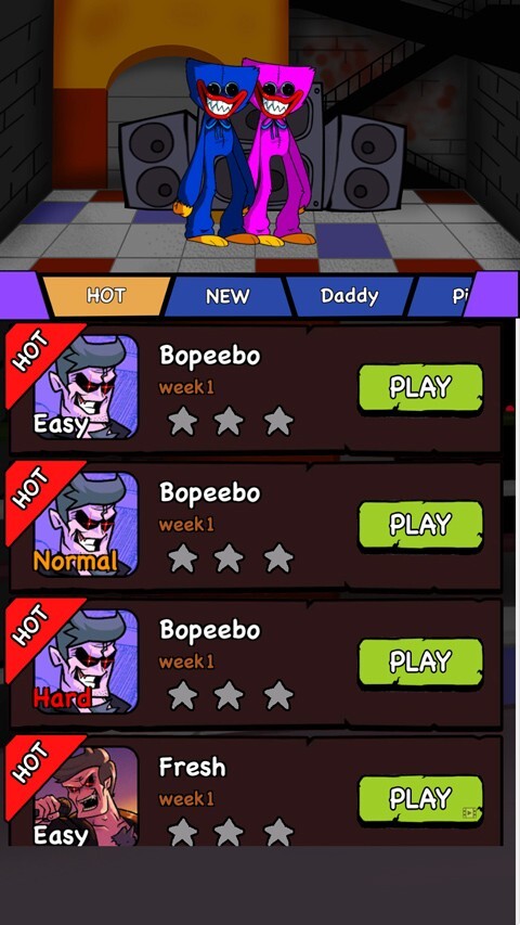 1、启动《周五夜放克》(Friday Night Funkin),游戏内提供丰富的模组可供挑选,接着选择游戏难度,难度共设简单、普通、困难三个等级。