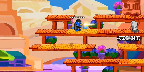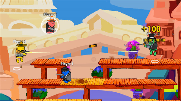 《混乱大枪战》是一款极具魔性的枪战格斗游戏,其玩法颇具特色。游戏主要的战斗方式,是将敌人打落到平台下方。而且游戏中不存在血量设定,这使得玩家容错空间较大,特别适合好友们一起开黑。玩游戏时,就在平台上努力把对手打下去吧!