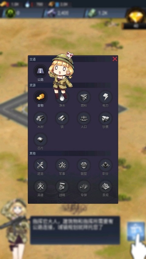 2在界面左侧找到“建造”选项并点击,进入后能看到各类可搭建的设施分类。其中交通类包含道路相关设施,资源类则涵盖了食物供给、饮用水处理、能源燃料、电力供应、木材储备、铁矿开采、人口安置以及芯片生产等多个方面的设施类型。
