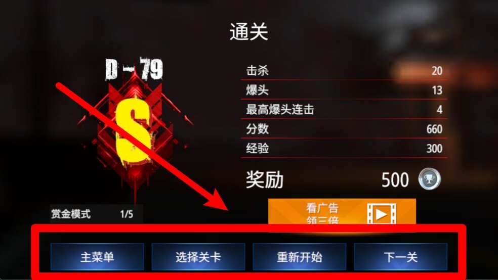 3. 通关后的选项栏:当完成关卡后,你能够选择返回主菜单、重新开始本关或者进入下一关。同时,系统会展示你的爆头数、击杀数以及经验奖励,便于你评估自己在本关的表现。