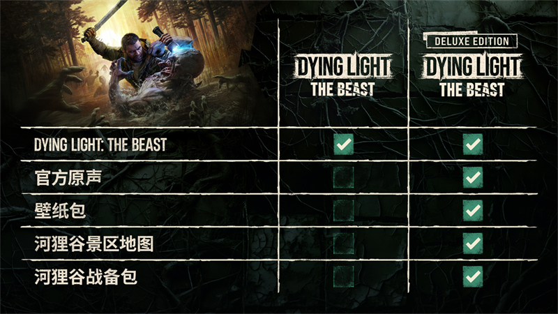 豪华版让《消逝的光芒:困兽》游戏体验更上一层楼。你将会获得官方原声、壁纸、河狸谷战备包。还有一张详细的景区地图,上面重点标记了哪些地方值得探索。