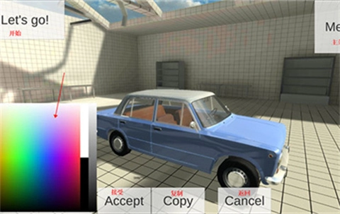 1、打开车祸物理模拟器,我们可以点击左右两边的箭头切换选择自己喜欢的车辆,也可以选择左下角【Color1】和【Color2】来自定义车身和车顶的颜色。