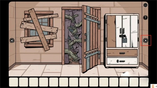 第二步,点击右侧箭头两下进入第二个房间,点击房门进入房间。
