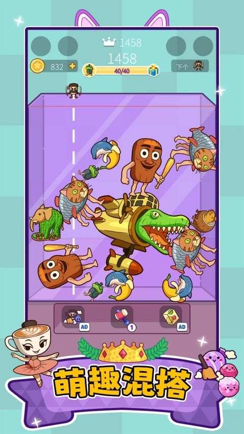 3.玩家通过点击屏幕控制宠物下落,将两个相同宠物堆叠合并成更大的宠物。