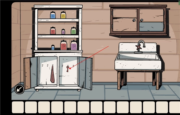 2、打开蓝色的门进入盥洗室,按照片上的提示摆放架子上的罐子,完成后拿走下面的「钥匙」。接着打开水池上方的柜子拿到「对讲机」,然后出去用钥匙打开钟表左侧的门。