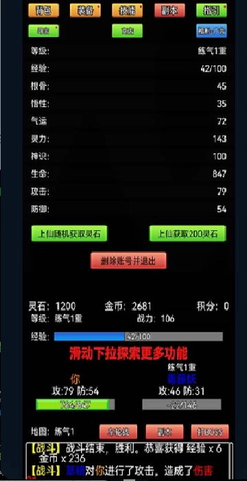1. 这是一款纯文字的挂机修仙游戏,即便你不在线,经验也会自动增长,每天只需上线收取经验就行。