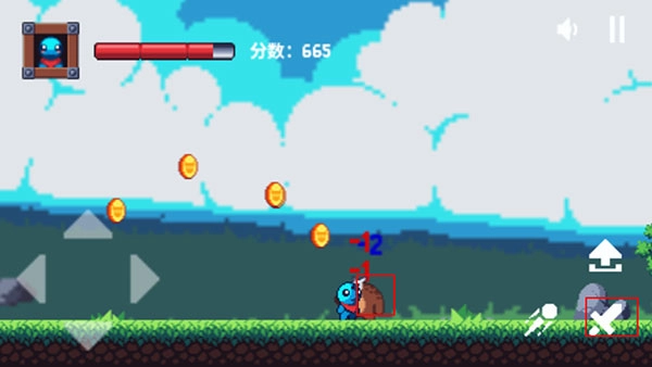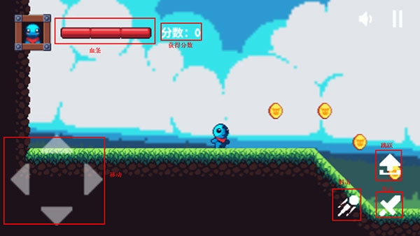 2、点击“开始游戏”,左边的按钮用于移动角色,右边的按钮可实现跳跃、远程射击以及近身攻击。