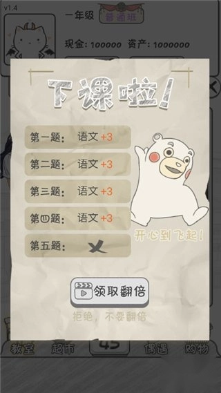 5、玩家通过持续参与各科考试提升成绩,当语文、数学、英语三门课程均达到60分以上,同时将日历天数归零时,即可触发升级条件。