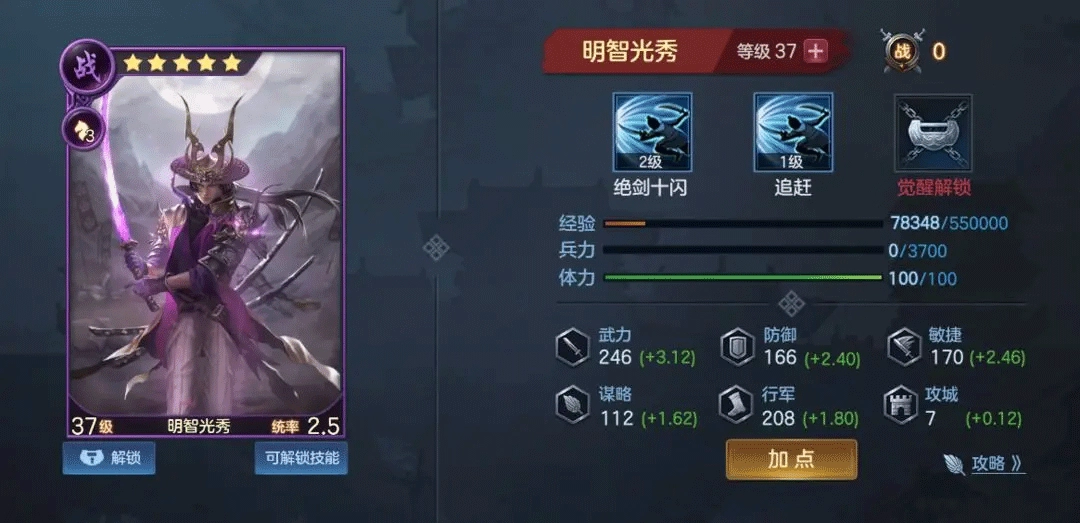 队伍中三个武将均为三星,玩家较容易获取多张,可进行进阶操作,获得可分配点数提高行军值。提升等级而也可提升行军属性及获得可分配属性点。