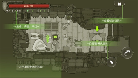 2、左半屏控制角色移动,右上角【查看任务记录】了解目标,通过【交互键/开火键】与场景互动或战斗