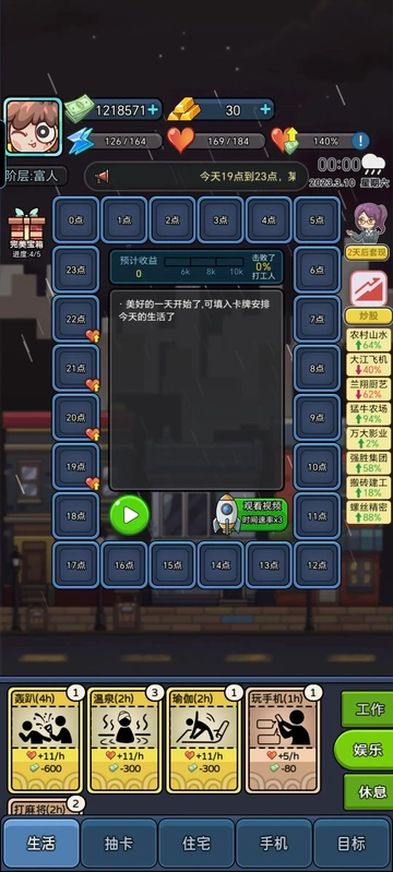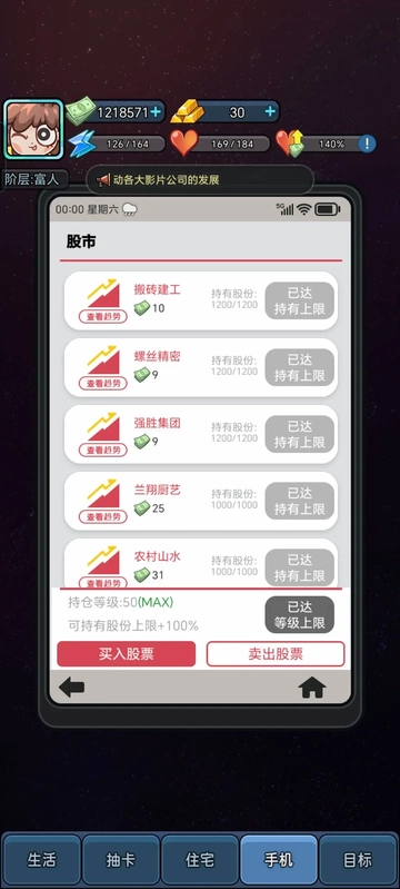 右上角的投资项目,只要资金充裕就可入手,多数情况下都能盈利。要是你已买入股票,页面右侧会有所显示,点击后就能直接进行买卖操作。