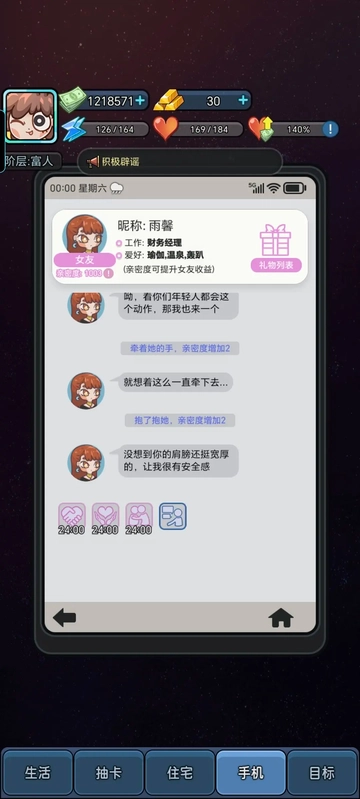 建议寻觅财务经理作为女朋友,彼此亲密度越高,收获的收益也就越多。要留意女友的爱好,当拥有那三张卡牌时,留到女友约你之际再使用,如此能增加更多亲密度。