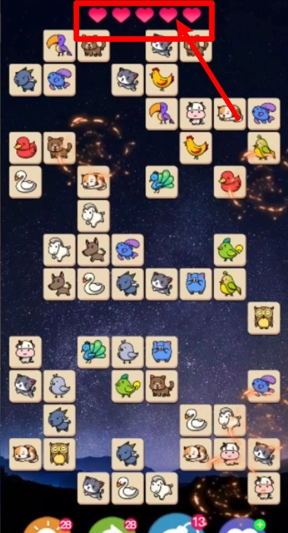 1. 生命机制设定:在画面的上方会展示爱心图标,此图标象征着玩家当下所剩余的挑战次数。一旦次数消耗殆尽,便判定为失败,玩家需要更为审慎地进行图案的策略搭配。