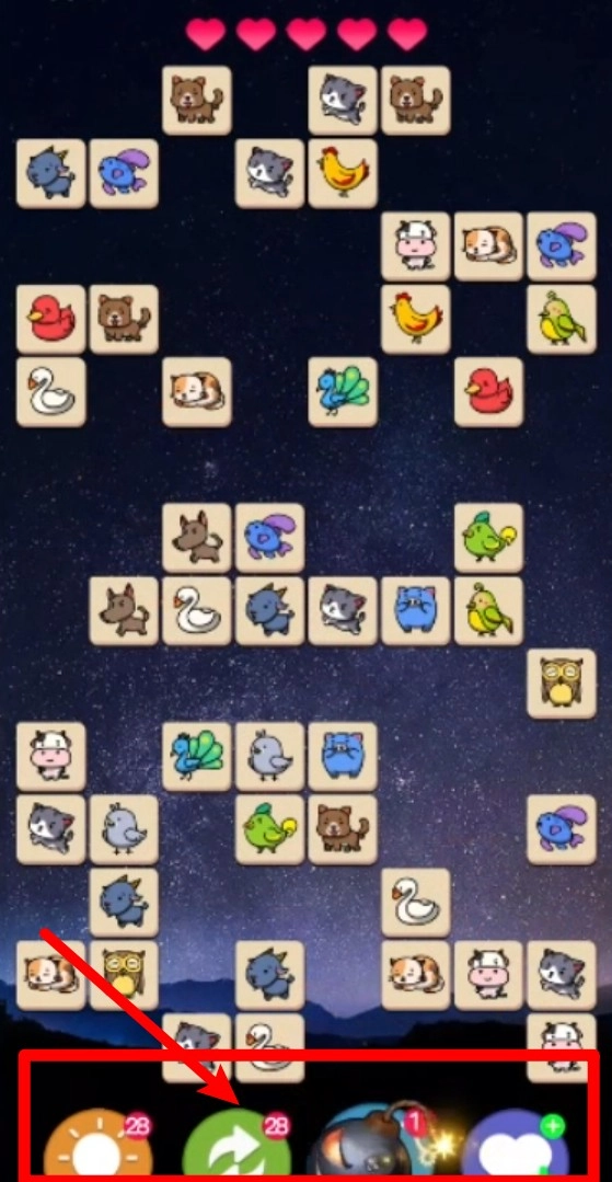2. 功能道具区域:底部设有多个实用道具按钮,像刷新、提示、重排等,合理运用这些道具,能助力玩家顺利通关,突破死局困境。