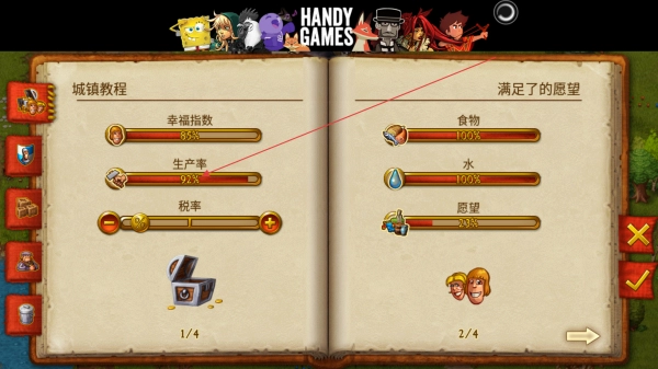 2. 点开城镇界面,查看幸福指数、生产率、税率等各项数值,以此了解城镇的具体状况。