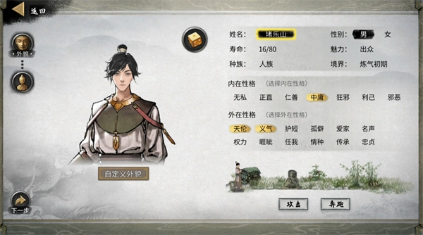4、经过一段加载等待时间后,玩家便能进入人物信息界面。在此界面,你能够自主修改角色的姓名、性别,以及内在与外在的性格,这些设定均会对游戏发展产生影响。此外,玩家还可进行自定义外观捏脸操作,不同的捏脸方式能够提升角色的魅力值。