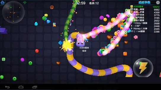 3、抢分期:战况依旧激烈,宛如一场大混战。与以往有所区别的是,蛇蛇一旦死亡,便会掉落更为可观的分数。众人见状,纷纷疯狂争抢这些分数,结果导致了连锁死亡的局面,一时间,地上满是分数。在这种状况下,只需巧妙借助散落在地的分数,吸引敌方前来吞食,而后算计将其坑杀,就能轻松赚到大量分数!