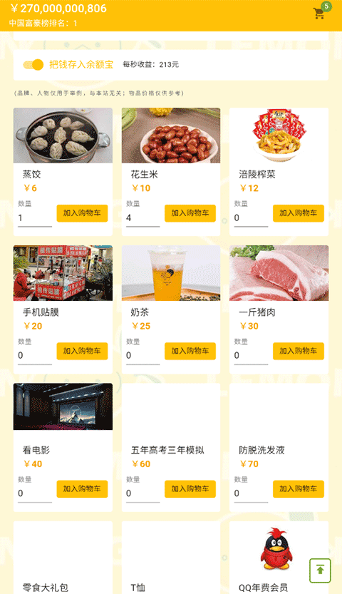 马云模拟器游戏试玩版,这可是一款趣味爆棚的模拟小游戏哦!它能让你真切感受到坐拥千亿身家是何种滋味。玩家刚踏入游戏,账户余额就直接显示2000亿元,眨眼间就摇身一变成为超级富豪啦。游戏里面有个购物商城,商品那叫一个琳琅满目,从涪陵榨菜、口红、饺子、猪肉,到茅台酒、演唱门票、奢侈品牌商品,还有钢琴、手机等等,简直无所不包。在这儿,你完全可以随心所欲地自定义商品数量并添加到购物车,购买流程轻松又便捷,一键就能把购物车清空,全方位满足你疯狂的购物欲望。甭管是什么商品,在马云模拟器里都能轻轻松松直接购买99+。就算在现实生活中你吃不起猪肉,只要玩这款游戏,立马就能咸鱼大翻身,随时随地畅享像马云那般有钱人的快乐,真的特别有意思呢!