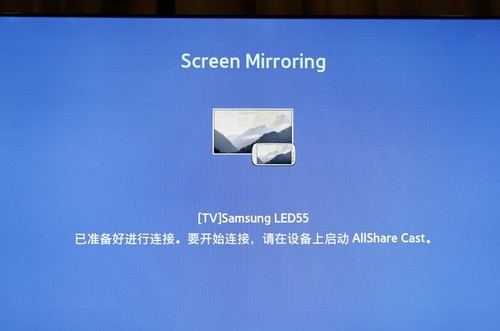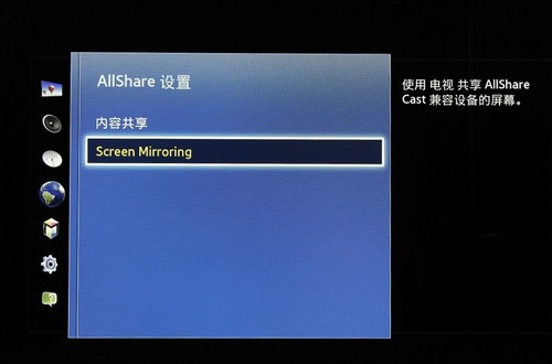 F8000遥控器运用触控与按键相结合的设计,划动操作极为灵敏,使用体验流畅,能让用户切实体会到通常只有高端智能电视产品才具备的舒适使用感受。具体操作时,我们在菜单里依次选择项目——网络——Allshare设置——Screen Mirroring,这时会看到电视屏幕提示连接已准备就绪,接着开启设备上的Allshare Cast功能。