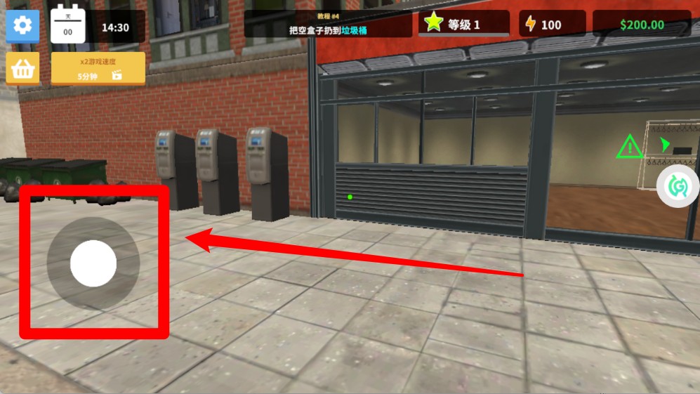 1通过操控屏幕左下角的虚拟摇杆来控制角色移动,在街道与店铺各处展开探索,以此完成开店前的准备工作,并熟悉周边环境。