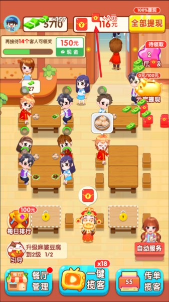 2.不断的招揽顾客来进行收益,提取经验提升饭店的等级