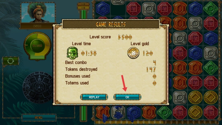 4、关卡结束后,点击【OK】按钮能够确认结算,随后开启下一关的冒险,或者也能选择重玩关卡,以提升成绩。