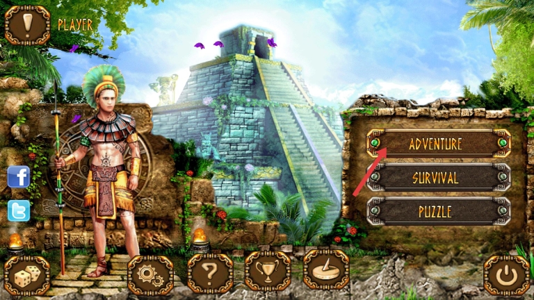 1. 只需点击【ADVENTURE】按钮,就能进入冒险模式。点击冒险后,便会开启古文明探险之旅,同时迎接宝石消除关卡的挑战。