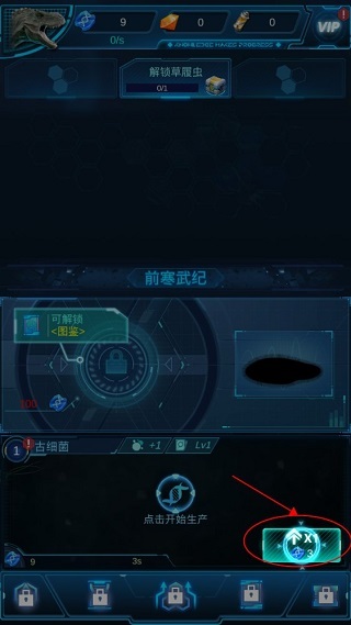 名字取号之后,点击生物发展的历史阶段,比如小编这里选择前寒武纪,点击图中所示,开始生产,升级古细菌可以提高DNA的产量。