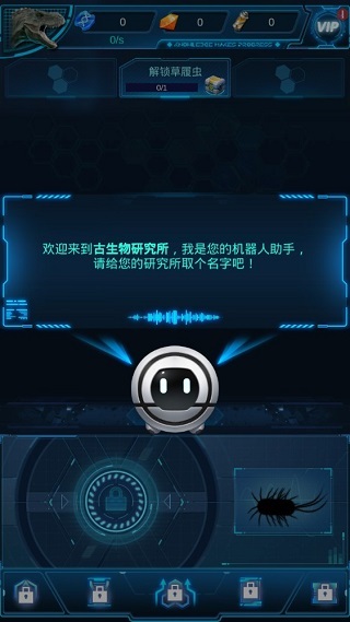 首先欢迎大家来到古生物研究所,通过前期机器人助手的帮助能够让你熟悉的了解游戏规则和玩法,但在此之前,先为您的研究所去个名字吧!