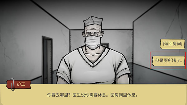 9、这时,点击房门,跟护工说【但是厕所堵了】;