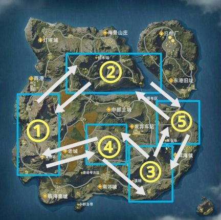 当装备与载具都准备妥当后,接下来要做的便是跑毒。此时,挑选一条人员稀少且地势平坦的路线就显得尤为关键。说来也巧,我们起初制定的战略便是农村包围城市,因而所规划的路线也大致如此,一步一步稳步推进。要是碰到合适的机会,还能趁机拿几个人头。依据以往积累的规律,总结归纳出以下路线,具体情况如图所示。