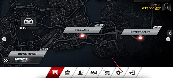 1、在本站下载安装好极品飞车17最高通缉手游,进入到游戏主页面点击如图所示的齿轮按钮;