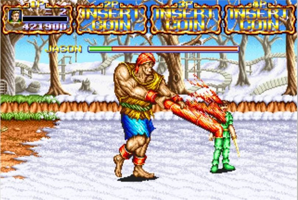 第二关:壮汉杰森,身形如巨人般魁梧,拥有强大的威力。战斗中,他会挥舞水管攻击,还会抓住人后用水管敲打。当血量减少一半时,便会召唤一个巨大铁球砸向对手(一旦被砸中,血量将大幅下降)。打败壮汉后的结局是:壮汉体力耗尽,最终被自己召唤出的大铁球压死。