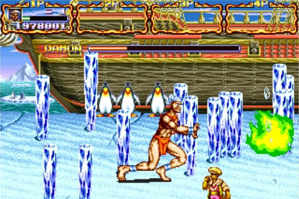 第四关:气功师达蒙(DAMON),攻击速度迅猛,威力强大。因其腿长优势,常以脚踢展开攻击,同时还能施展气功,甚至会召唤冰柱落下。(最终结局:死亡)