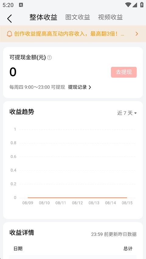 5、作品的具体收益可以点击“创作中心”的“收益提现”查看。