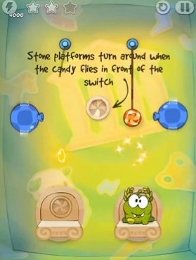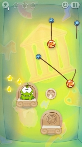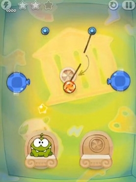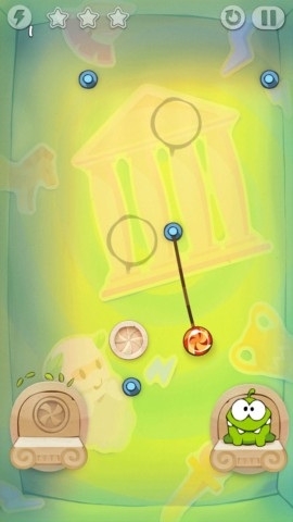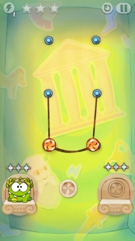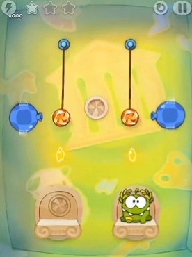 3.玩家需要结合关卡内的道具,将绳子割断后,让糖果落到两个可爱的小奥姆嘴中。