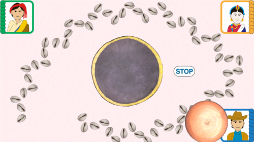 每人持有9枚码号,游戏场地以64枚贝壳排布出65个棋位,贝壳外侧为起点、内侧为终点。