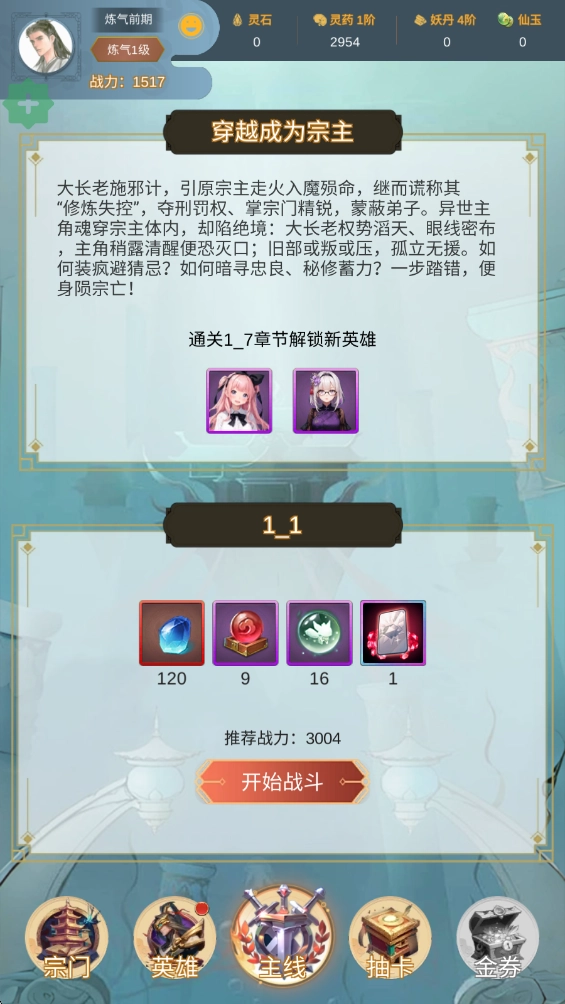 通过抽卡或游历方式招募弟子,消耗灵石、妖丹等资源提升她们的等级与境界,并搭配合理的功法和装备。