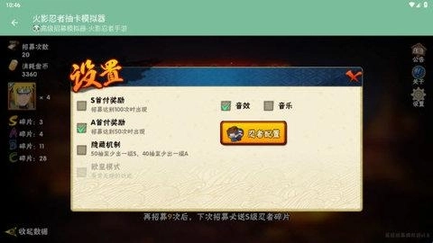 7、设置中的“忍者配置”选项可以保证我们100%招募出所选择的忍者碎片。