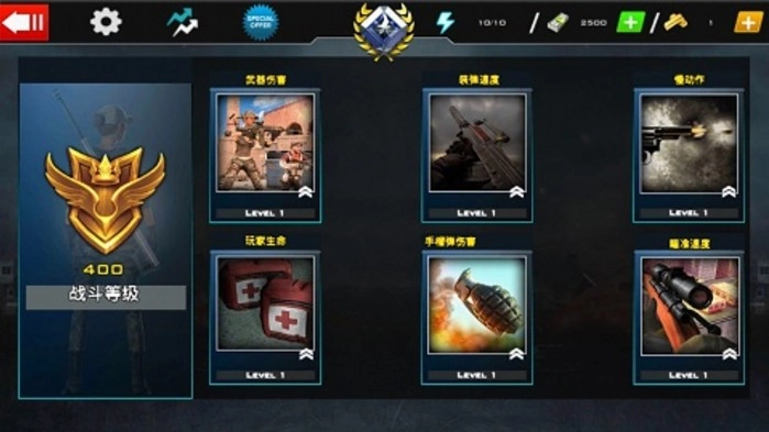 2.打造出了非常好听且细腻的音效背景,你将会有一种置身于战场上的感受,除此之外还拥有大量有趣的任务和挑战在等待玩家体验,你要运用金钱在其中购买获得更多的升级道具,并解锁更加强大的武器,不仅如此还要将自己的角色武装到牙齿轻松的完成不同的任务。