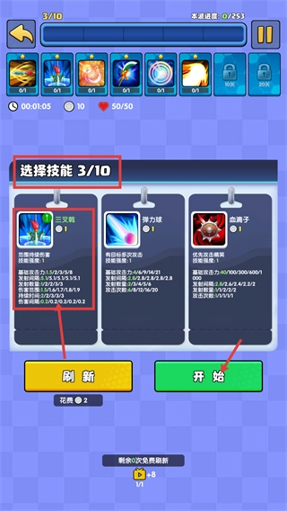 3在关卡推进至选择技能的第三个节点(当前为第3步,共10步)时,建议挑选具备范围性持续伤害效果的技能类型,比如类似三叉戟的技能;选定后,点击“开始”按钮即可进入下一关卡环节。