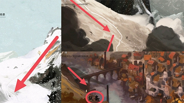 1、这一关的通关方式很简单,只要沿着山道一路向下走就行,途中会有不少转弯的地方,算是一个能欣赏风景的福利章节。你就这么一直走,直到最后看到有张小纸条飞过来,点击打开它,等剧情结束后就能开启下一个章节了。