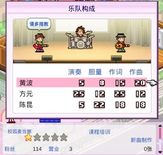在制作新曲时,乐队或是引退的人中选择与你要提升的领域需要创意相同的人,他们在作词和作曲时可以增加该创意的基础点数,从而减少你需要投入的点数。