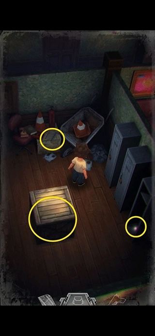 箱子是储物箱,可以存储物品(男主的背包容量有限,可以把暂时用不到的东西装进储物箱)。杂物间的门需要钥匙,用红圈标识。走到如图所示的位置,按照箭头的方向面向这个铁制置物架,松开***,长按屏幕任意处就可以朝男主面向的方向推动物品,把架子推开后,从墙壁空缺处走进另一个房间。