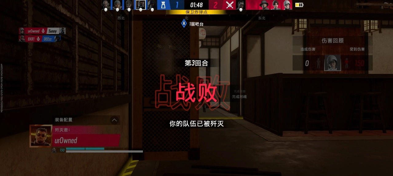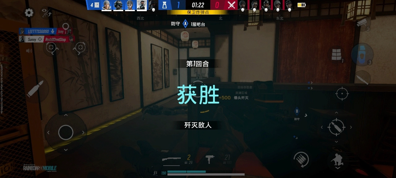 7、比如第一轮我们就是防守方,会出生在餐厅内,我们要做的就是使用干员技能布置陷阱,或者加固墙面,等待进攻方进攻。在消灭所有的进攻方以后,获得第一轮胜利(1VS0)