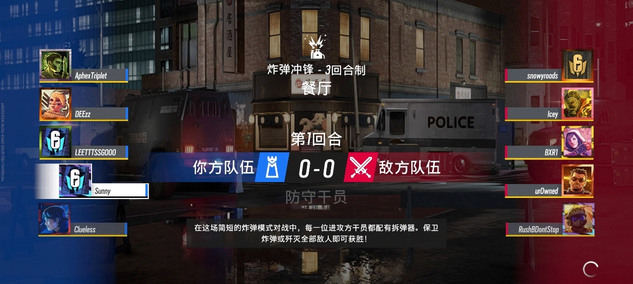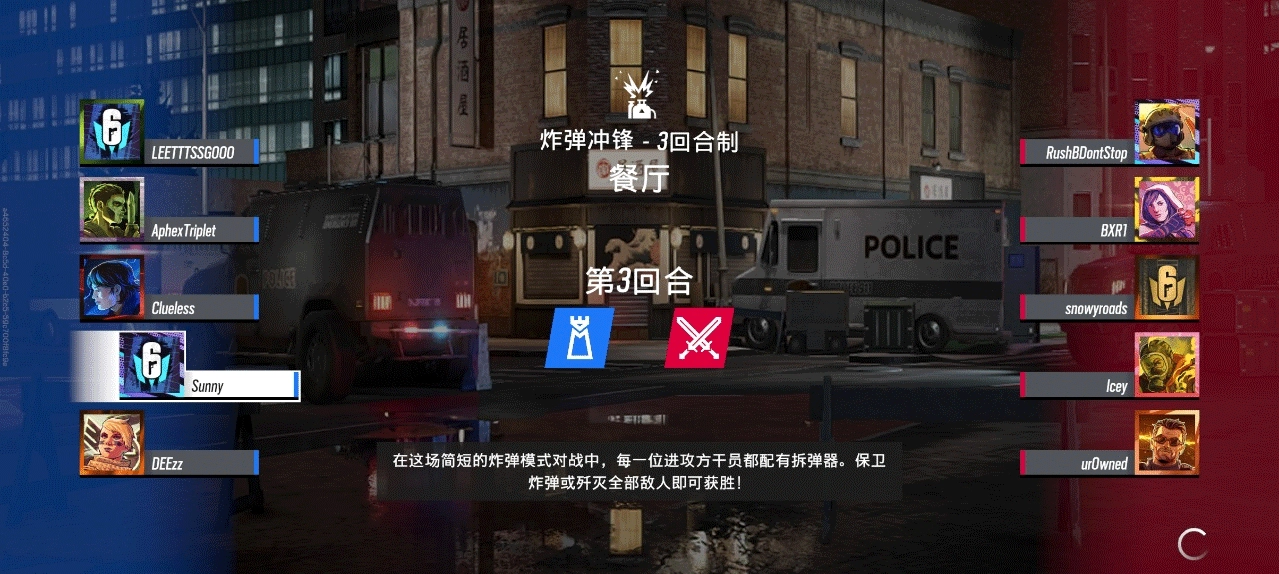 6、匹配完成以后,就会进入随机的地图中。游戏的模式采用三局两胜制,阵营分为防守方和进攻方,每次进入对局都是随机