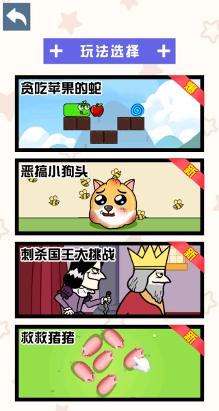 1、在玩法选择页,可按需挑选 “贪吃苹果的蛇”“恶搞小狗头” 等不同玩法。