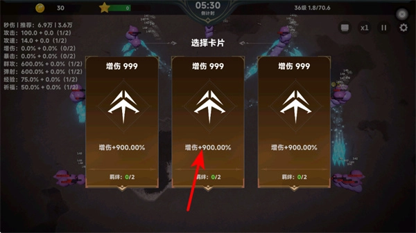 1、选卡阶段点击增伤+900.00%卡片,可大幅提升角色的伤害输出,战斗能力的关键操作,优先选择高增益卡片助力清敌。